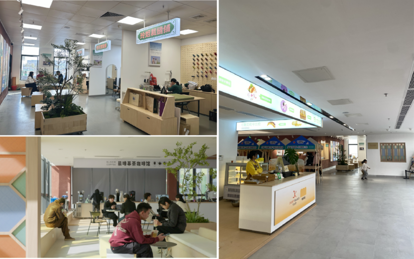 项目建设前期,引入七彩集团进行运营前置,创新“60%公益空间+ 40%商业空间”的混合运营模式:约1000㎡惠民空间通过租金减免等方式,孵化爱心理发、便民维修等便民业态;
