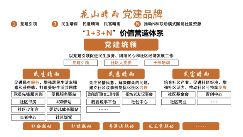 打造“花山晴雨”党建品牌,形成“1+3+N”治理体系: