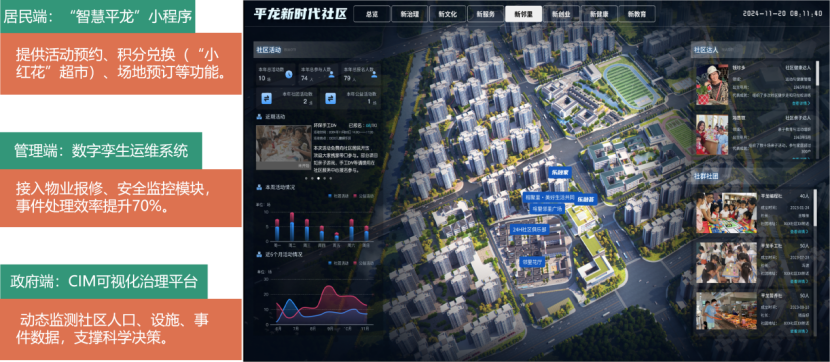构建“三端融合”数字系统:居民端:“智慧平龙”小程序支持活动预约、积分兑换、场地预订;管理端:数字孪生运维系统提升事件处理效率70%;政府端:CIM可视化平台动态监测社区人口、设施与事件,支撑科学决策。通过“小红花”积分体系串联场景,累计发起活动593场,吸引参与1.2万人次。
